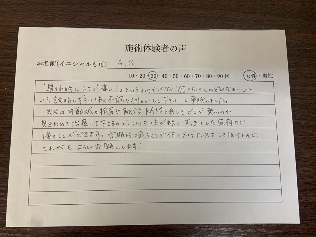 先生は可動域の検査や触診、問診を通してどこが悪いのか見極めて治療して下さるので、いつも体が軽く、すっきりした気持ちで帰ることができます。定期的に通うことで体のメンテナンスをしていただけるのでこれからもよろしくお願いします!