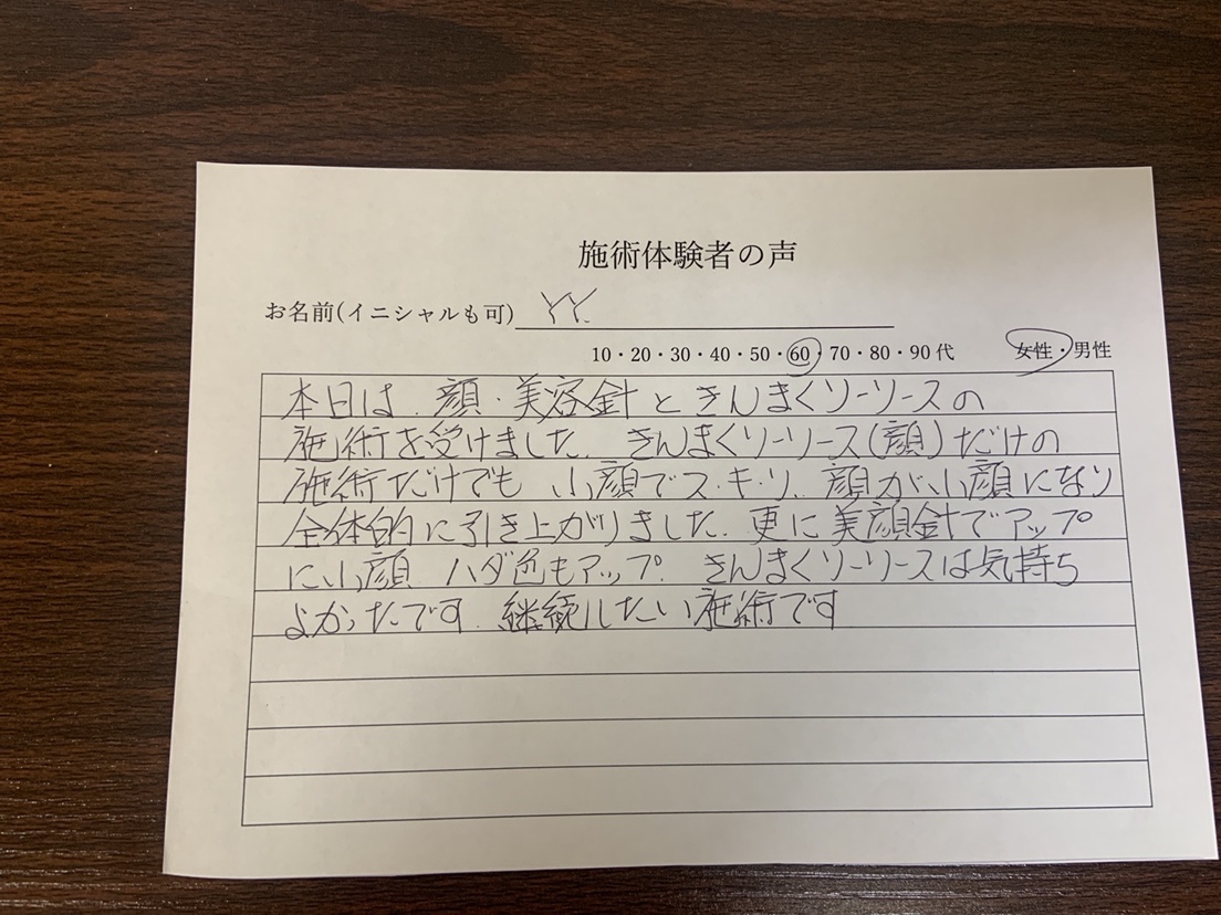 本日は顔・美容針ときんまくリリースの施術を受けました。きんまくリリース(顔)だけの施術だけでも小顔でスッキリ。顔が小顔になり全体的に引き上がりました。