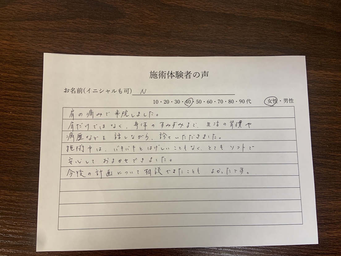 施術中は、バキバキとはげしいこともなく、とてもソフトで安心しておまかせできました。